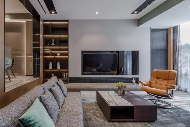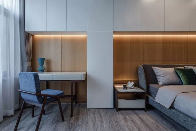 设计师捋以多样的自然材质元素,以优雅的比例与材质色彩变化,坚持在材质选择与细节上的设计品位,以多种蓝色贯穿空间,在丰富多层次的灯光效果下,构建了一个具高质感和舒适感的生活空间,体现了一种“平静的奢华”。
