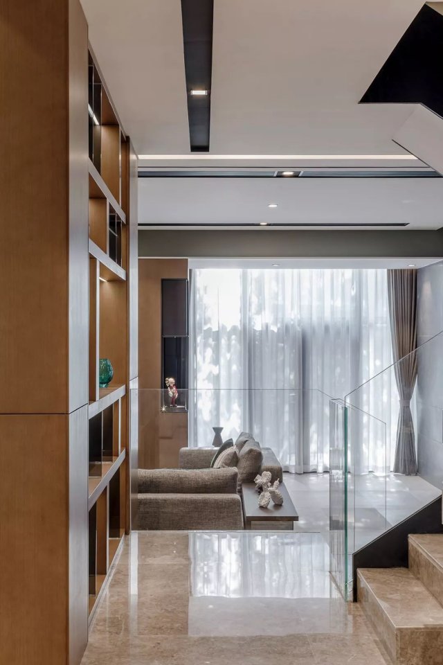 从入户的大门进入空间,入户的鞋帽柜穿插着展示功能的开放搁架,主人的收藏品从一进门的开始就可以展示。右手边卫生间干区的台面悬挑出来,被一面玻璃从中切割,形成独特的穿插美学。左手边的中厨,开放式西厨和餐厅一字排开,在中厨和过道之间,设计师结合原建筑的“L”形柱,用木作和深色玻璃打造了一面展示隔断,在视觉和空间上围合了餐厅区域,使之更具围合的聚合感。沿着过道来到一层的中心客厅,这里的下沉结构设计师将楼梯进行多层次的艺术化处理,使之更具有韵律的雕塑美感,将客厅和阳台打通,获得更为宽敞的视觉和空间效果,但随之而来的一根承重柱则在客厅暴露出来,这里设计师将柱子的形态进行了重新设计,使它具有重点展示功能,KAWS的解剖玩偶放置这里,时尚而新颖。电视墙的设计则依靠了空间的层高优势布置了通高的展示架,在光影交错中演绎了精致而纯粹的美学。