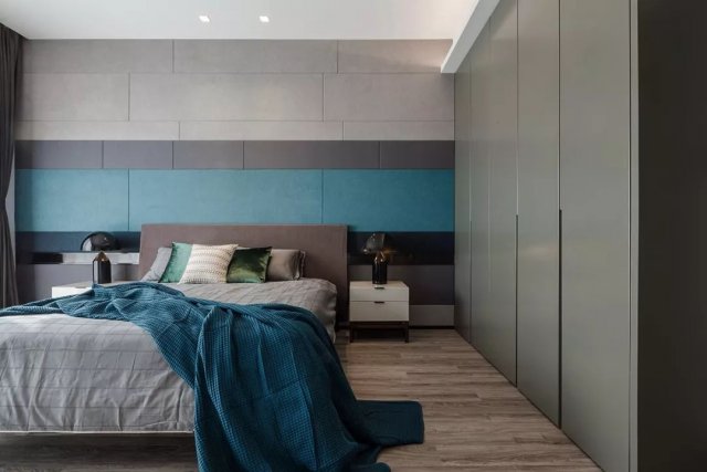 三层的儿子房被嵌入式的移门分割成了和睡眠区和阅读的学习区,空间有序分割,床头用了多种色相的蓝色横向分割,用构成的手法形成一面多彩而统一的视觉中心。
